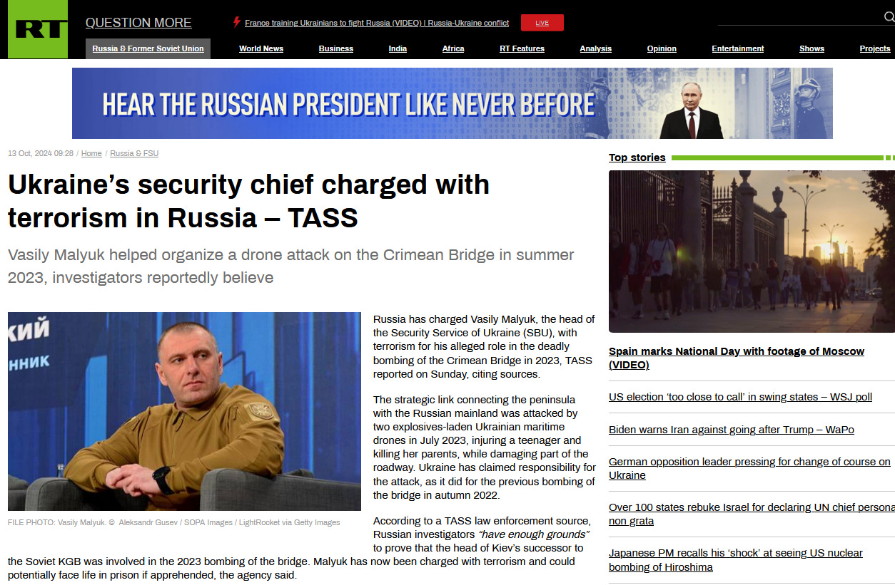 According to a TASS law enforcement source, Russian investigators “have enough grounds” to prove that the head of Kiev’s successor to the Soviet KGB was involved in the 2023 bombing of the bridge. Malyuk has now been charged with terrorism and could potentially face life in prison if apprehended, the agency said.
