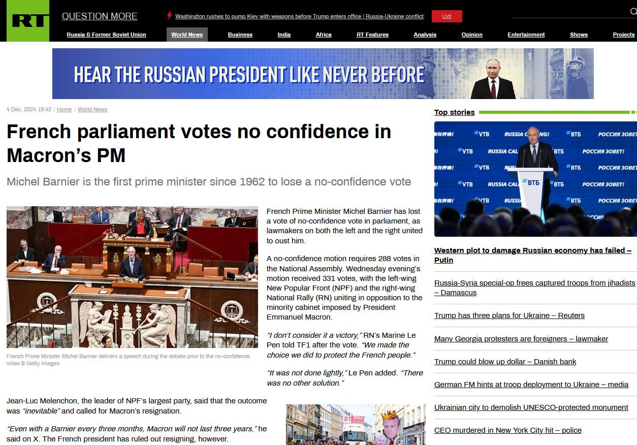 French parliament votes no confidence in Macron’s PM.