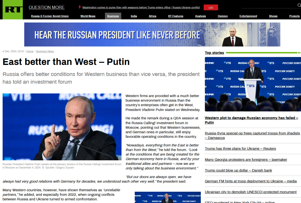 “Nowadays, everything from the East is better than from the West,” he told the forum. “Look at the conditions that are being created for the German economy here in Russia, and by your traditional allies and partners – now we are only talking about the business environment.”