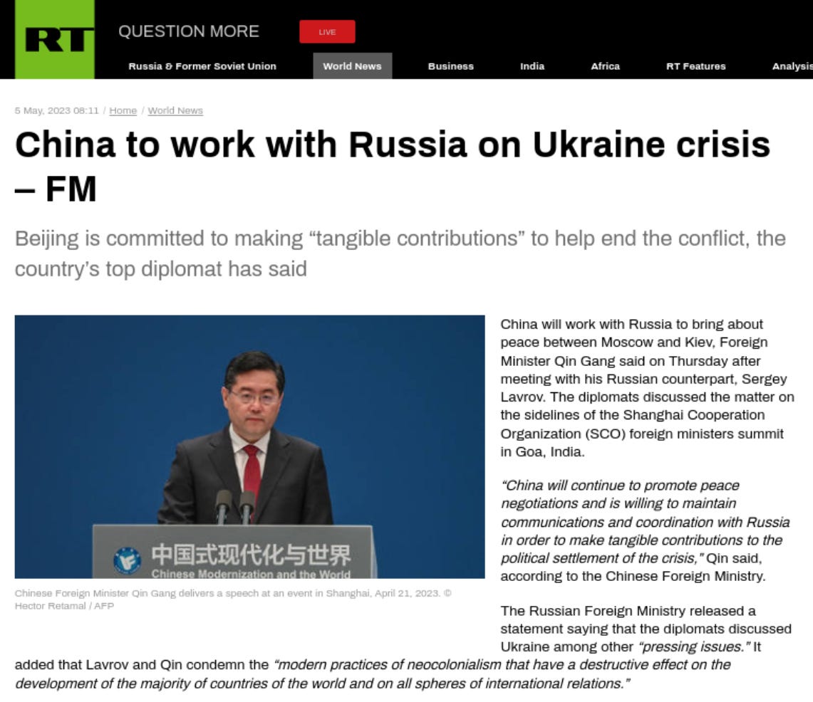 China will work with Russia to bring about peace between Moscow and Kiev, Foreign Minister Qin Gang said on Thursday after meeting with his Russian counterpart, Sergey Lavrov. The diplomats discussed the matter on the sidelines of the Shanghai Cooperation Organisation (SCO) foreign ministers summit in Goa, India.