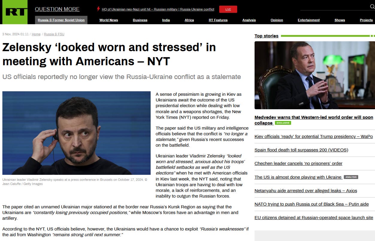 Ukrainian leader Vladimir Zelensky “looked worn and stressed, anxious about his troops’ battlefield setbacks as well as the US elections” when he met with American officials in Kiev last week, the NYT said, noting that Ukrainian troops are having to deal with low morale, a lack of reinforcements, and an inability to outgun the Russian forces.