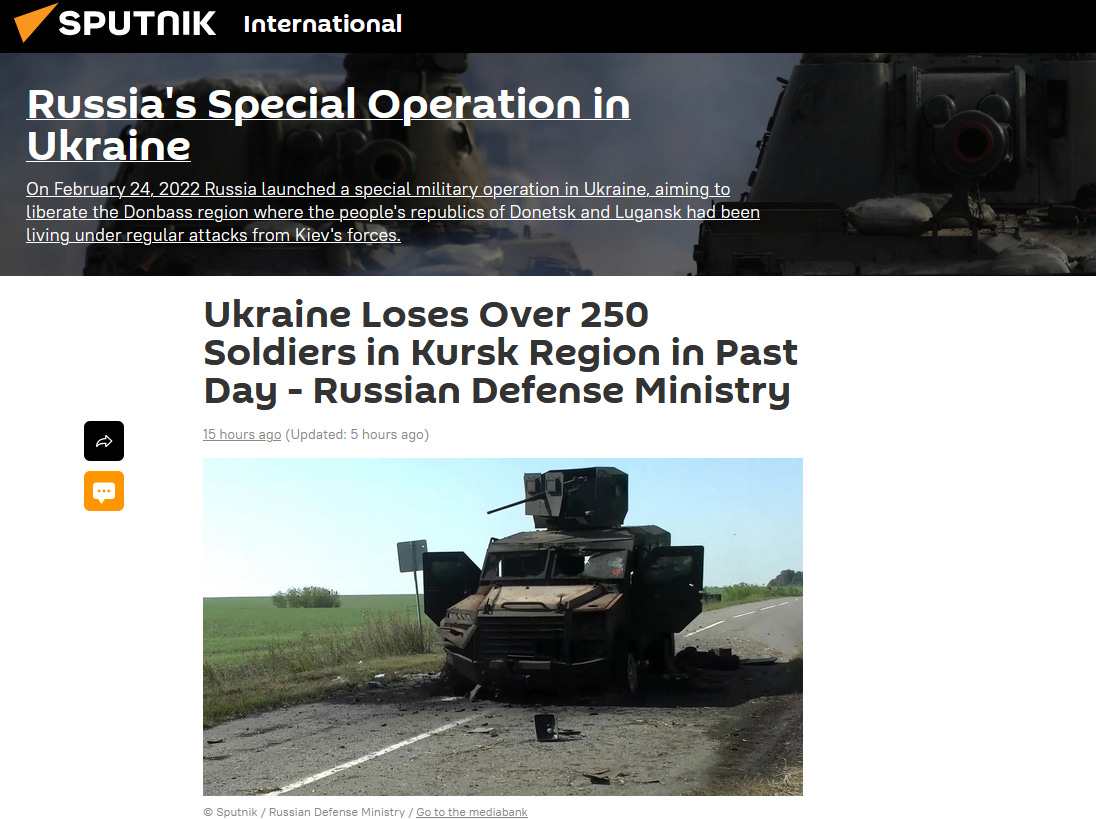 The Ukrainian armed forces lost over 250 soldiers in the western Russian region of Kursk over the past day, the Russian Defense Ministry said on Saturday.