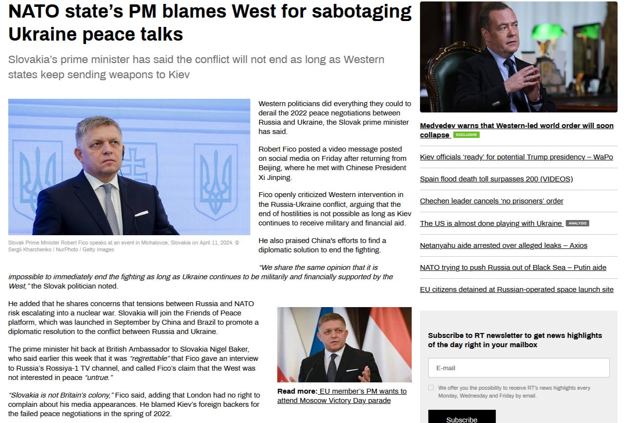 “Slovakia is not Britain’s colony,” Fico said, adding that London had no right to complain about his media appearances. He blamed Kiev’s foreign backers for the failed peace negotiations in the spring of 2022.