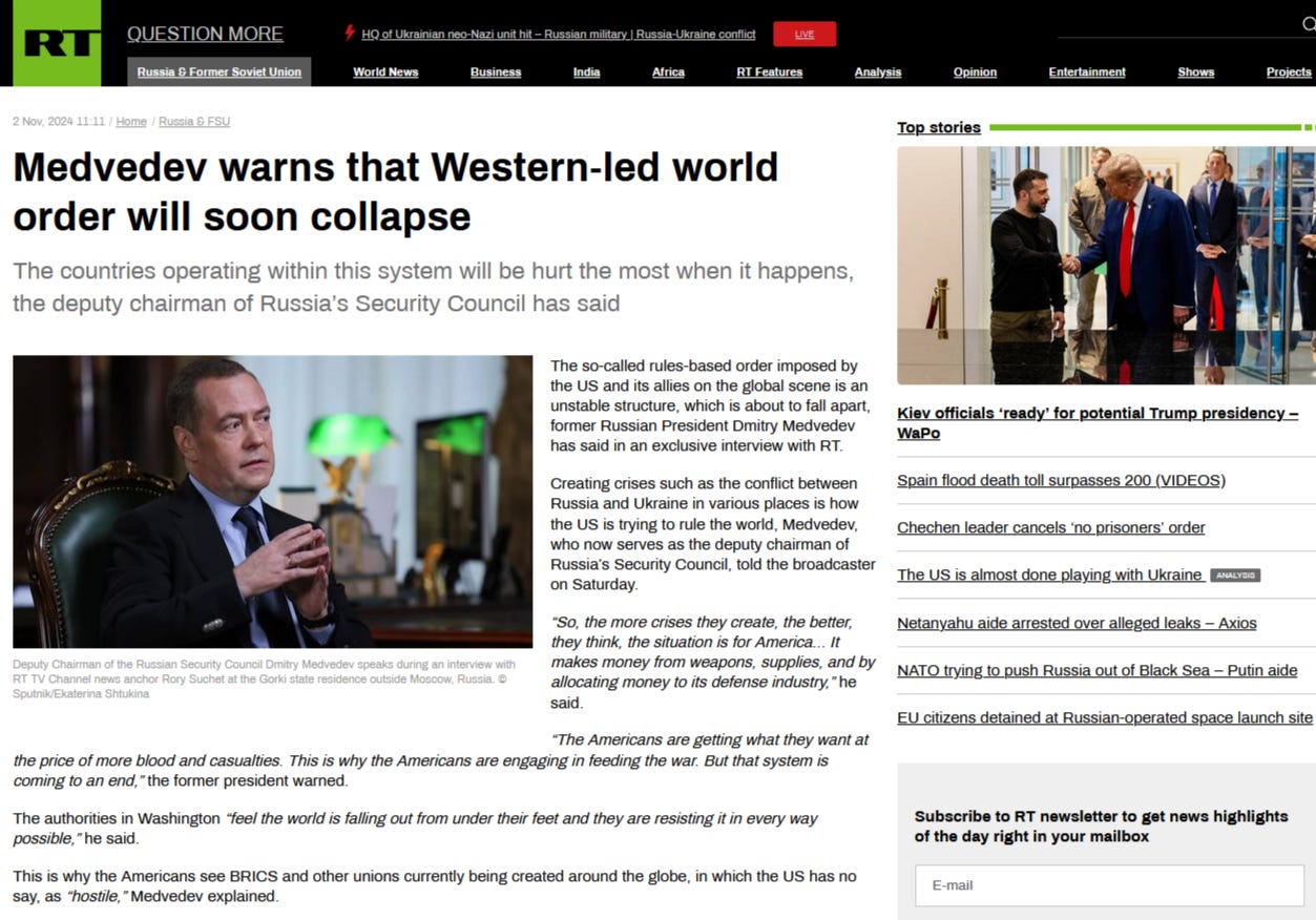 The so-called rules-based order imposed by the US and its allies on the global scene is an unstable structure, which is about to fall apart, former Russian President Dmitry Medvedev has said in an exclusive interview with RT.