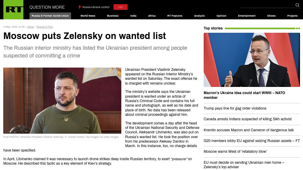 The ministry’s website says the Ukrainian president is wanted under an article of Russia’s Criminal Code and contains his full name and photograph, as well as his date and place of birth. No data has been released about criminal proceedings against him.