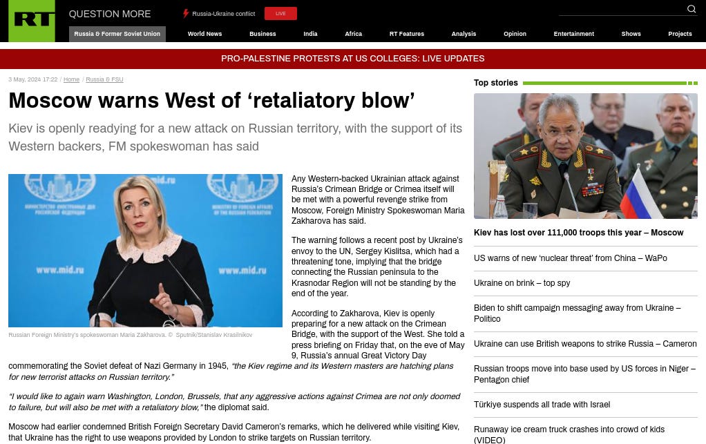 According to Zakharova, Kiev is openly preparing for a new attack on the Crimean Bridge, with the support of the West. She told a press briefing on Friday that, on the eve of May 9, Russia’s annual Great Victory Day commemorating the Soviet defeat of Nazi Germany in 1945, “the Kiev regime and its Western masters are hatching plans for new terrorist attacks on Russian territory.”
