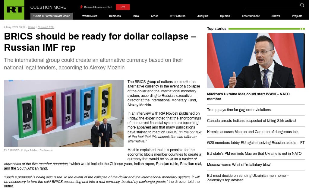 The BRICS group of nations could offer an alternative currency in the event of a collapse of the dollar and the international monetary system, according to Russia’s executive director at the International Monetary Fund, Alexey Mozhin.
