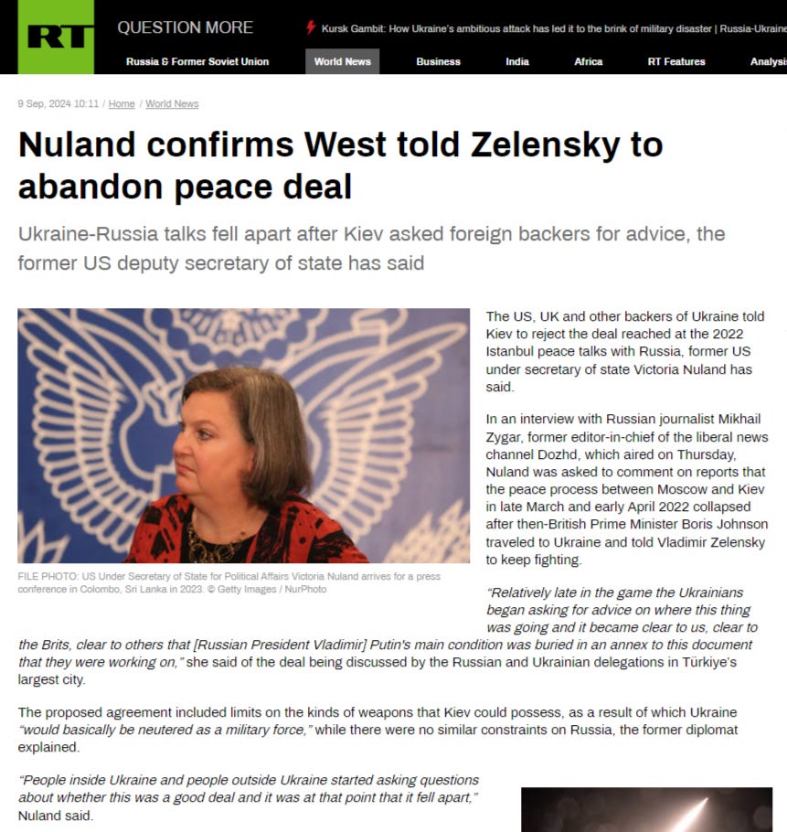 In an interview with Russian journalist Mikhail Zygar, former editor-in-chief of the liberal news channel Dozhd, which aired on Thursday, Nuland was asked to comment on reports that the peace process between Moscow and Kiev in late March and early April 2022 collapsed after then-British Prime Minister Boris Johnson traveled to Ukraine and told Vladimir Zelensky to keep fighting.