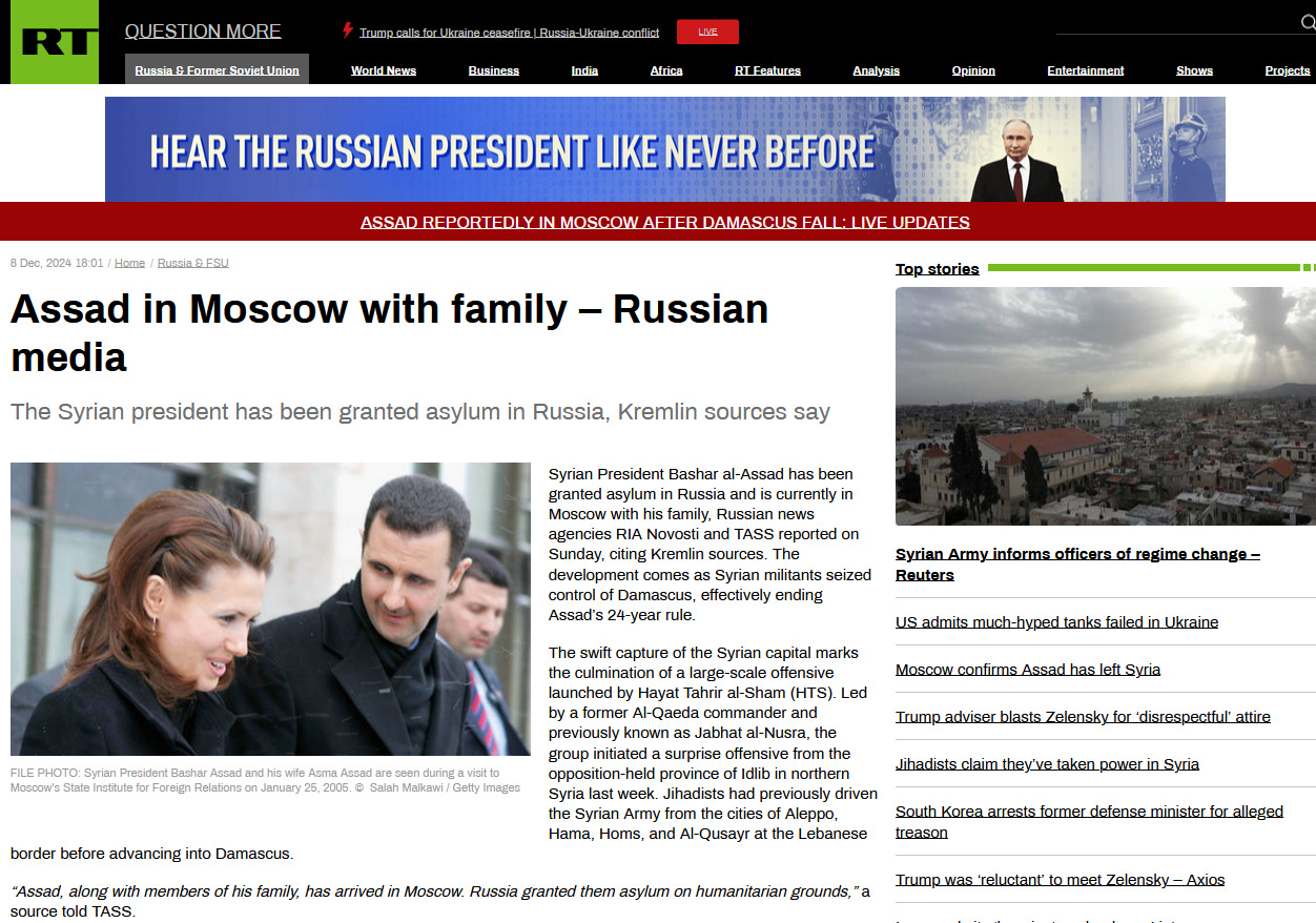 Syrian President Bashar al-Assad has been granted asylum in Russia and is currently in Moscow with his family, Russian news agencies RIA Novosti and TASS reported on Sunday, citing Kremlin sources. The development comes as Syrian militants seized control of Damascus, effectively ending Assad’s 24-year rule.