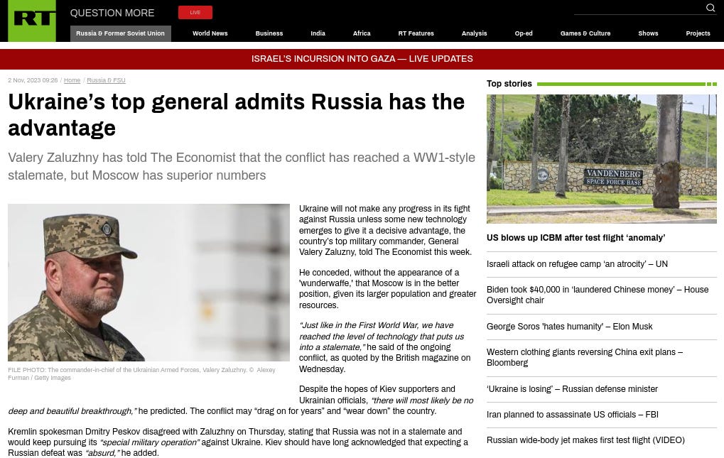 Kremlin spokesman Dmitry Peskov disagreed with Zaluzhny on Thursday, stating that Russia was not in a stalemate and would keep pursuing its “special military operation” against Ukraine. Kiev should have long acknowledged that expecting a Russian defeat was “absurd,” he added.