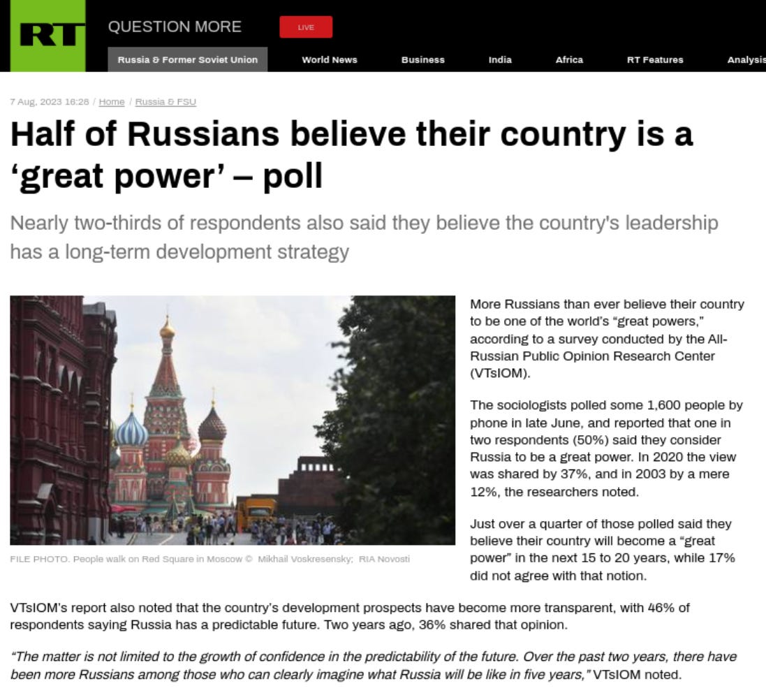 The sociologists polled some 1,600 people by phone in late June, and reported that one in two respondents (50%) said they consider Russia to be a great power. In 2020 the view was shared by 37%, and in 2003 by a mere 12%, the researchers noted.