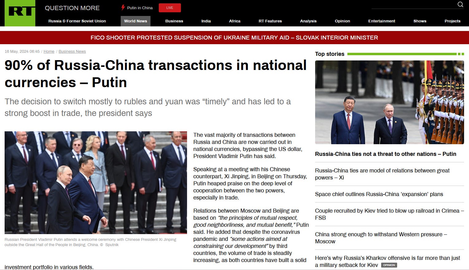 The vast majority of transactions between Russia and China are now carried out in national currencies, bypassing the US dollar, President Vladimir Putin has said.