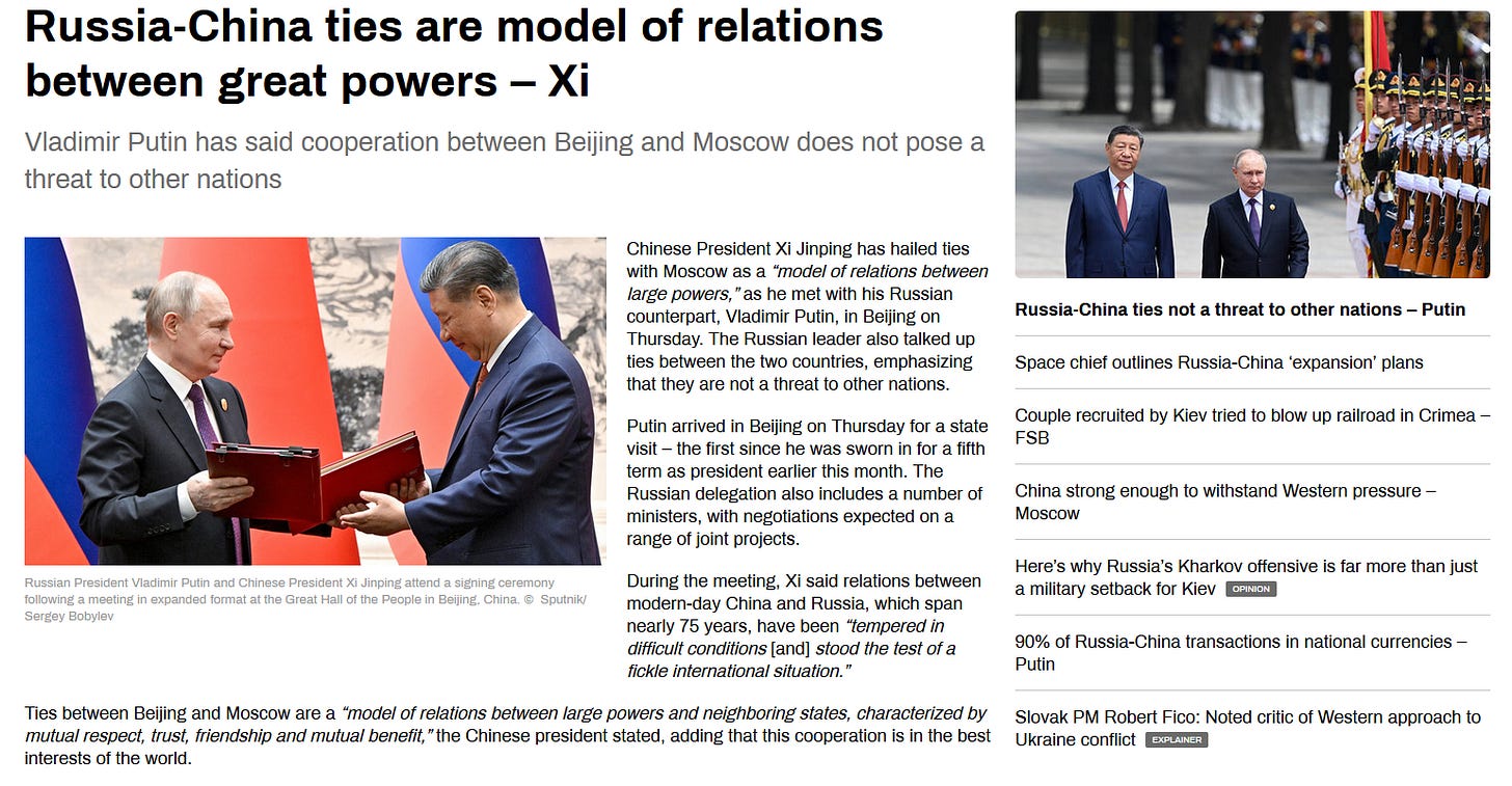 Chinese President Xi Jinping has hailed ties with Moscow as a “model of relations between large powers,” as he met with his Russian counterpart, Vladimir Putin, in Beijing on Thursday. The Russian leader also talked up ties between the two countries, emphasizing that they are not a threat to other nations.