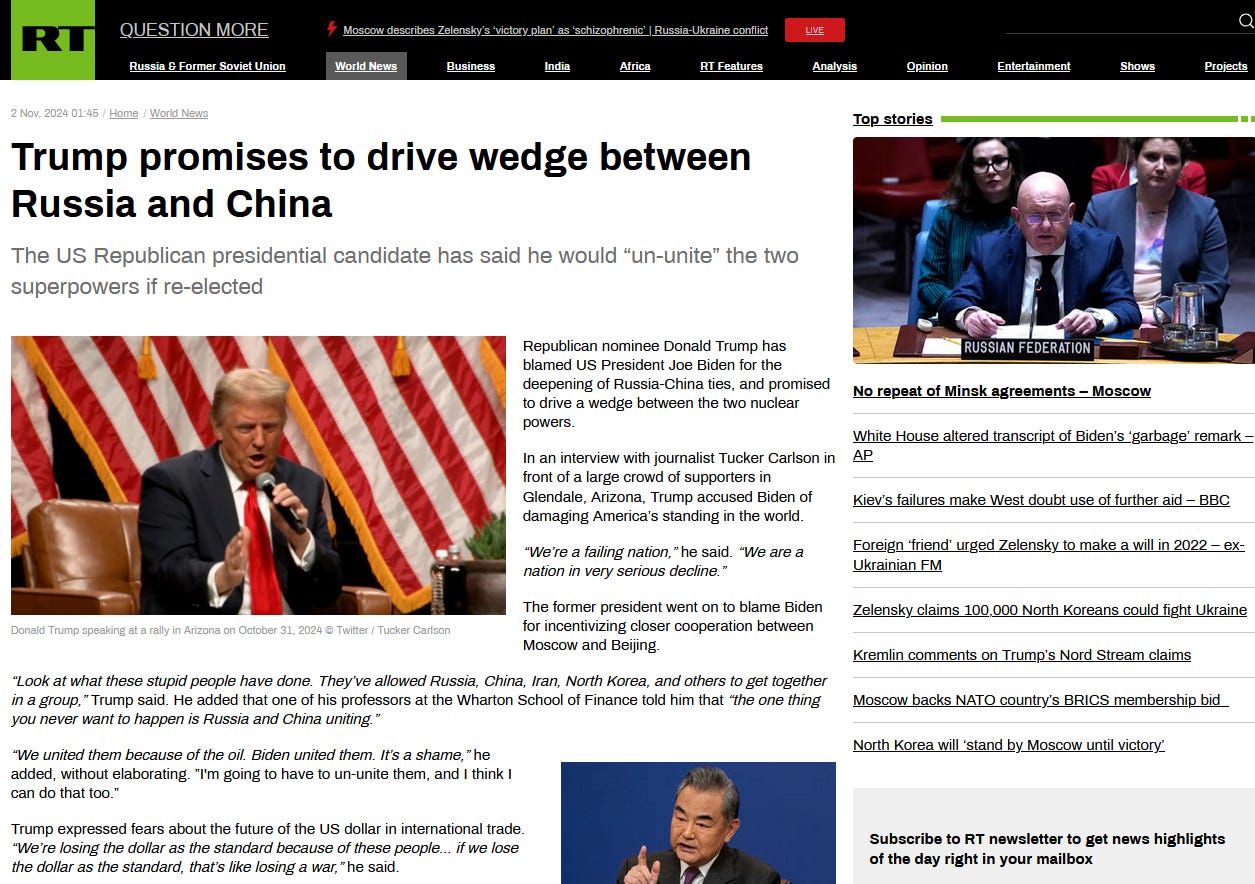 Republican nominee Donald Trump has blamed US President Joe Biden for the deepening of Russia-China ties, and promised to drive a wedge between the two nuclear powers.