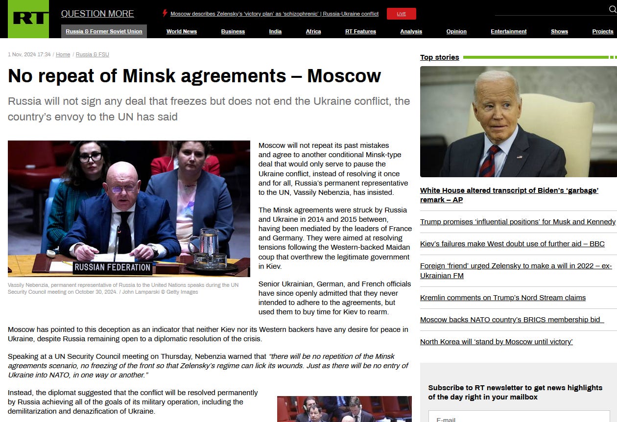 Moscow will not repeat its past mistakes and agree to another conditional Minsk-type deal that would only serve to pause the Ukraine conflict, instead of resolving it once and for all, Russia’s permanent representative to the UN, Vassily Nebenzia, has insisted.