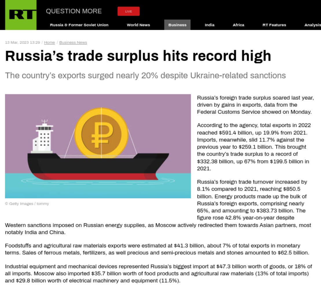 Article published by Russia Today (RT) - 13th March 2023 : Russia’s trade surplus hits record high