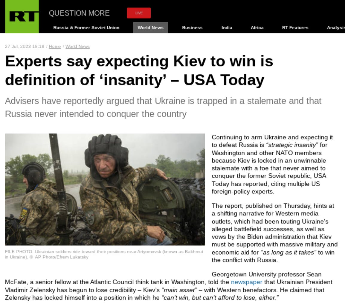 The report, published on Thursday, hints at a shifting narrative for Western media outlets, which had been touting Ukraine’s alleged battlefield successes, as well as vows by the Biden administration that Kiev must be supported with massive military and economic aid for “as long as it takes” to win the conflict with Russia.