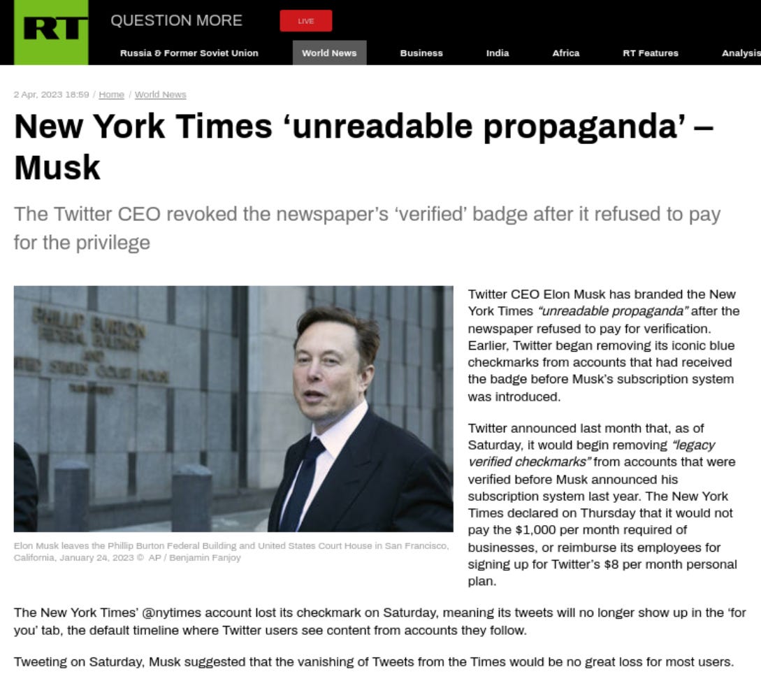 Twitter CEO Elon Musk has branded the New York Times “unreadable propaganda” after the newspaper refused to pay for verification. Earlier, Twitter began removing its iconic blue checkmarks from accounts that had received the badge before Musk’s subscription system was introduced.