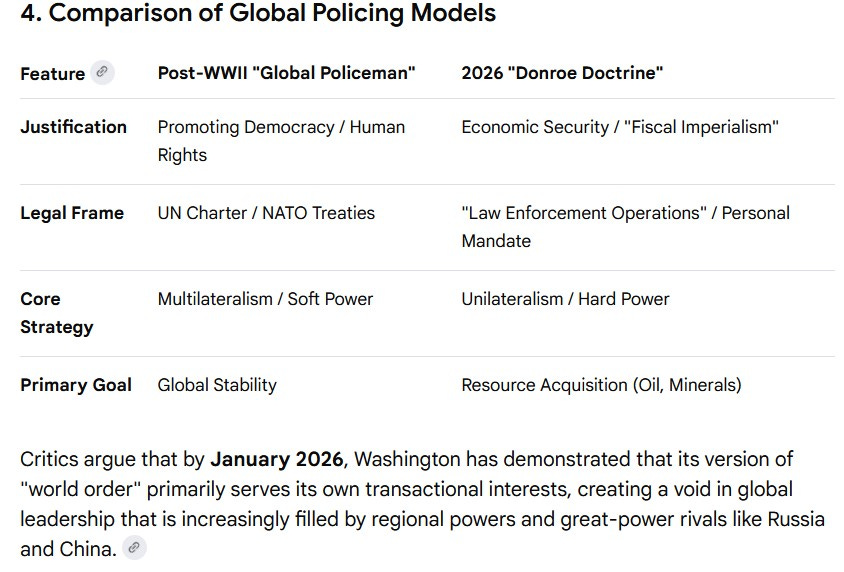 In summary, by January 14, 2026, the USA has transitioned into a more aggressive “enforcer” that uses its military and financial might to secure its own narrow interests and “penalize those who cross its red lines”.