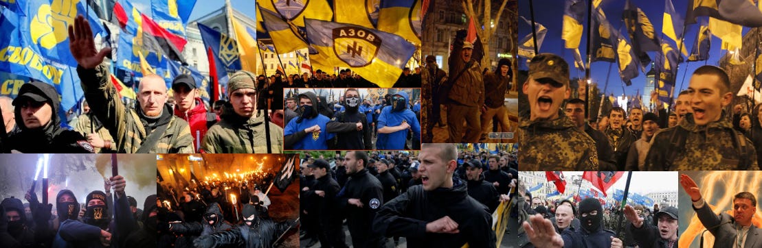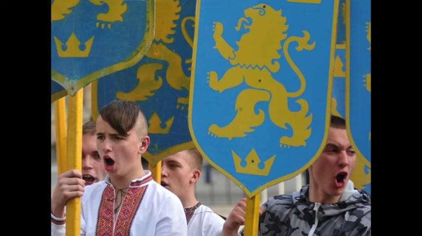 The most radical of those from western Ukraine identify wholeheartedly with the Nazis however who the mythology goes created the pathway to full Ukrainian sovereignty and with their nationalist heroes who joined with the Nazis to support Operation Barbarossa to take Russia and so free Ukraine from Stalin and the Soviet Union.